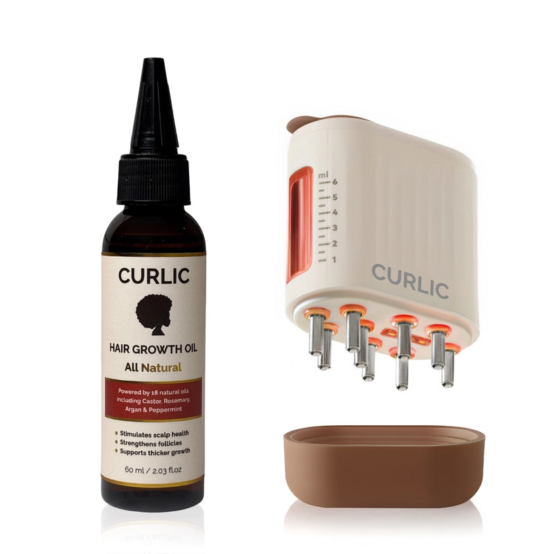 Pair our oil with the Curlic device to supercharge absorption. Its gentle massage stimulates circulation, ensuring every drop works harder and faster for noticeable regrowth.